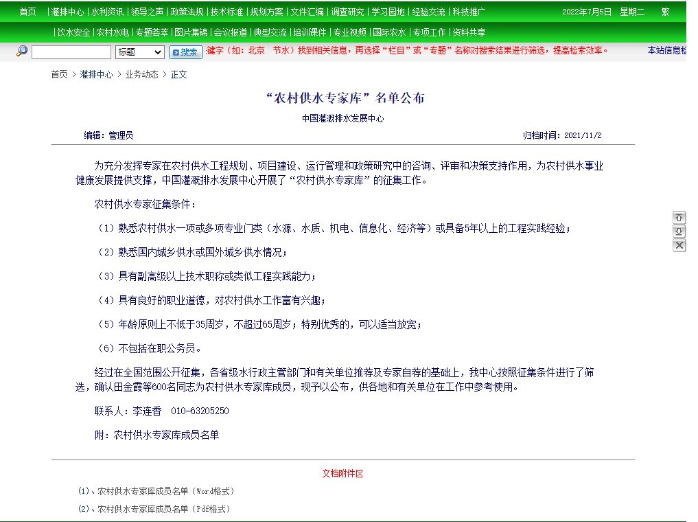 为充分发挥专家在农村供水工程规划、项目建设、运行管理和政策研究中的咨询、评审和决策支持作用,为农村供水事业健康发展提供有力支撑。近日,水利部中国灌溉排水发展中心开展了“农村供水专家库”的征集工作。 经过全国范围公开征集,各省级水行政主管部门和有关单位推荐及专家自荐,中国灌溉排水发展中心按照征集条件进行筛选后,最终全国600名同志入选农村供水专家库成员(其中湖南省75名)。岳阳县洞庭供水公司总经理贺建荣在本次湖南省被入选全国“农村供水专家库”的名单行列,该同志2018年撰写的《浅谈城乡供水一体化项目中农村规模水厂厂址选择的重要性》论文获国家二等奖。